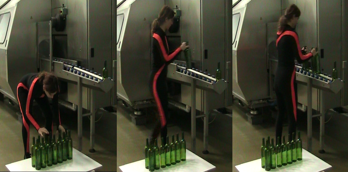 La forma de sujetar las botellas entre los dedos genera una postura forzada de la mano y muñeca. El movimiento se realiza unas 20 veces/minuto y en cada mano se cogen 3 botellas con un peso aproximado de 1,2 kg en total.